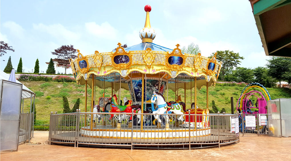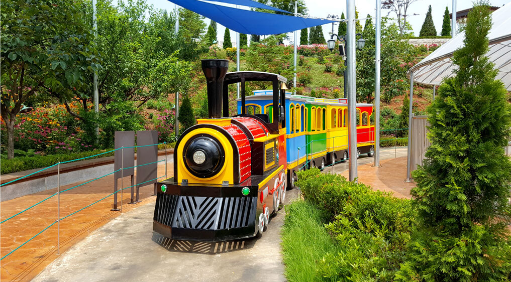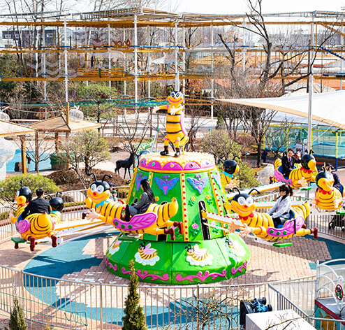 여러 놀이시설이 있는 공간으로 꼬마열차, 회전목마, 범퍼카 등 재미있는 놀이시설들이 모여 있습니다.
