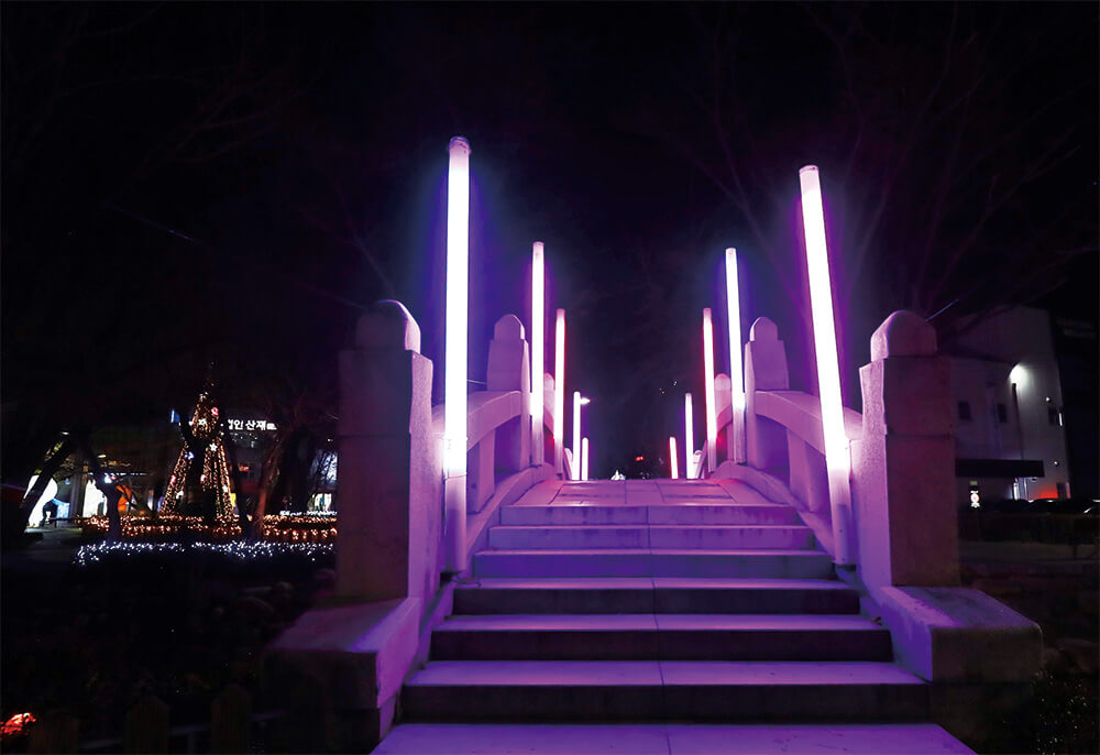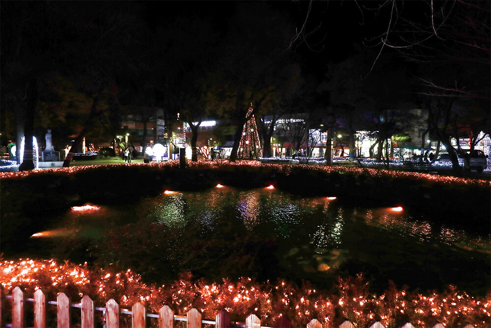 황지연못에서의 다양한 빛 조형물의 경관조명을 볼 수 있습니다.